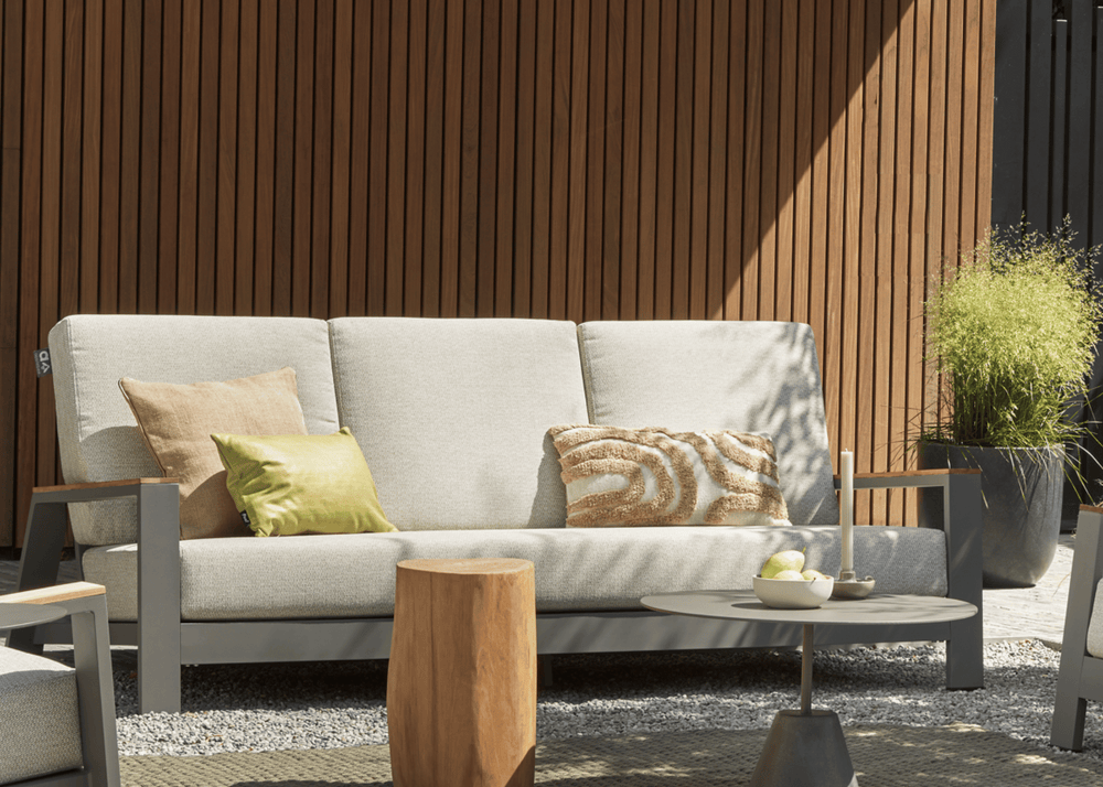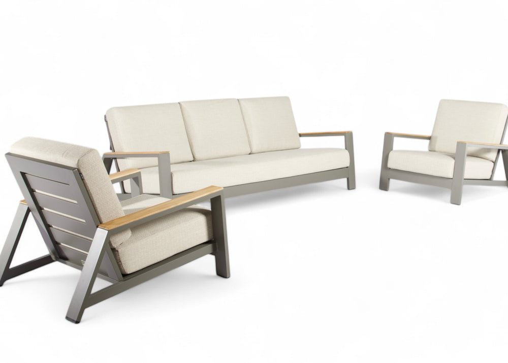 Het Taupe aluminium frame en de teakhouten leuningen zijn weerbestendig en onderhoudsvrij, voor jarenlang zorgeloos genieten met een warme, natuurlijke uitstraling.