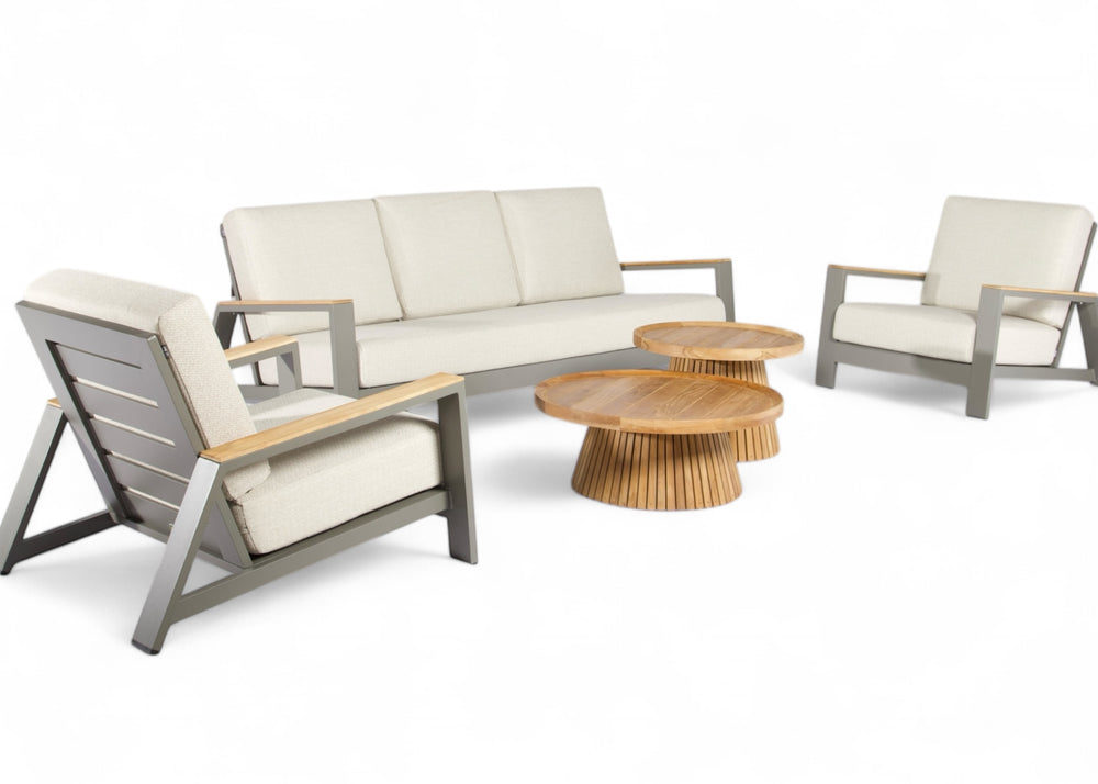 De Apple Bee Spring Loungeset en de twee Belito Daan koffietafels combineert een moderne uitstraling met natuurlijk comfort. Met zijn taupe gepoedercoat aluminium frame en stijlvolle teakhouten accenten in de leuningen, is deze set een prachtige toevoeging aan elke tuin of terras.