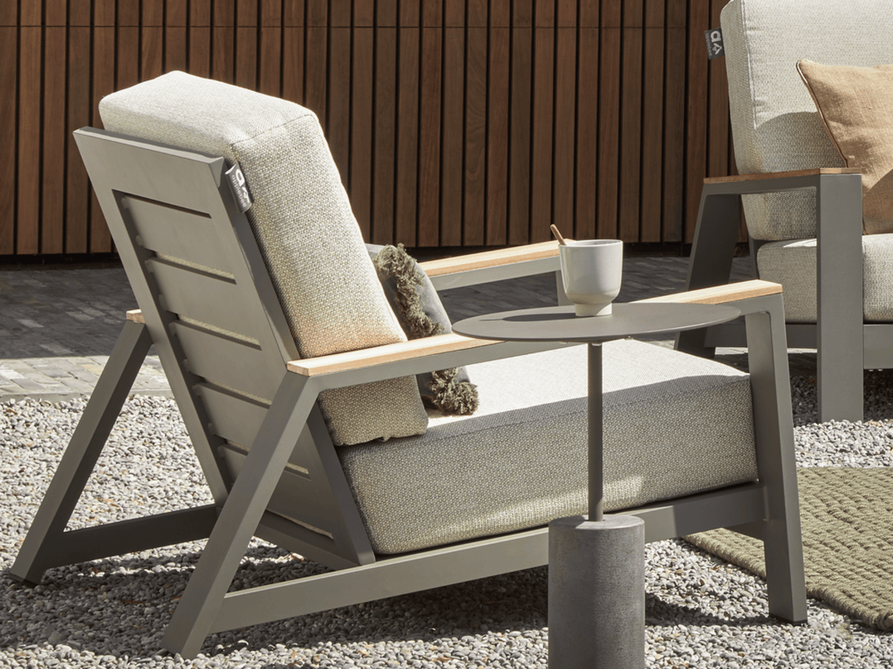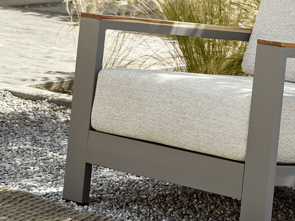 Het Taupe aluminium frame en de teakhouten leuningen zijn weerbestendig en onderhoudsvrij, voor jarenlang zorgeloos genieten met een warme, natuurlijke uitstraling.
