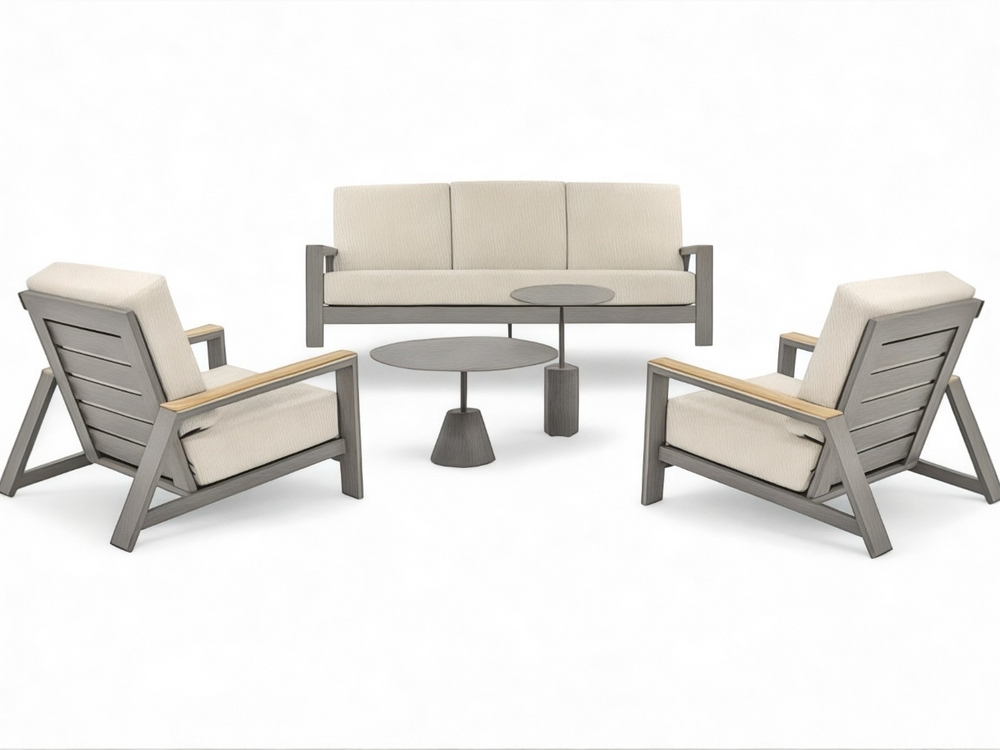 De Apple Bee Spring Loungeset combineert een moderne uitstraling met natuurlijk comfort. Met zijn grijs gepoedercoat aluminium frame en stijlvolle teakhouten accenten in de leuningen, is deze set een prachtige toevoeging aan elke tuin of terras. Dankzij de optionele uitbreidingsmogelijkheden, zoals het toevoegen of verwijderen van een stoel, is deze loungeset perfect aanpasbaar aan elke buitenruimte.