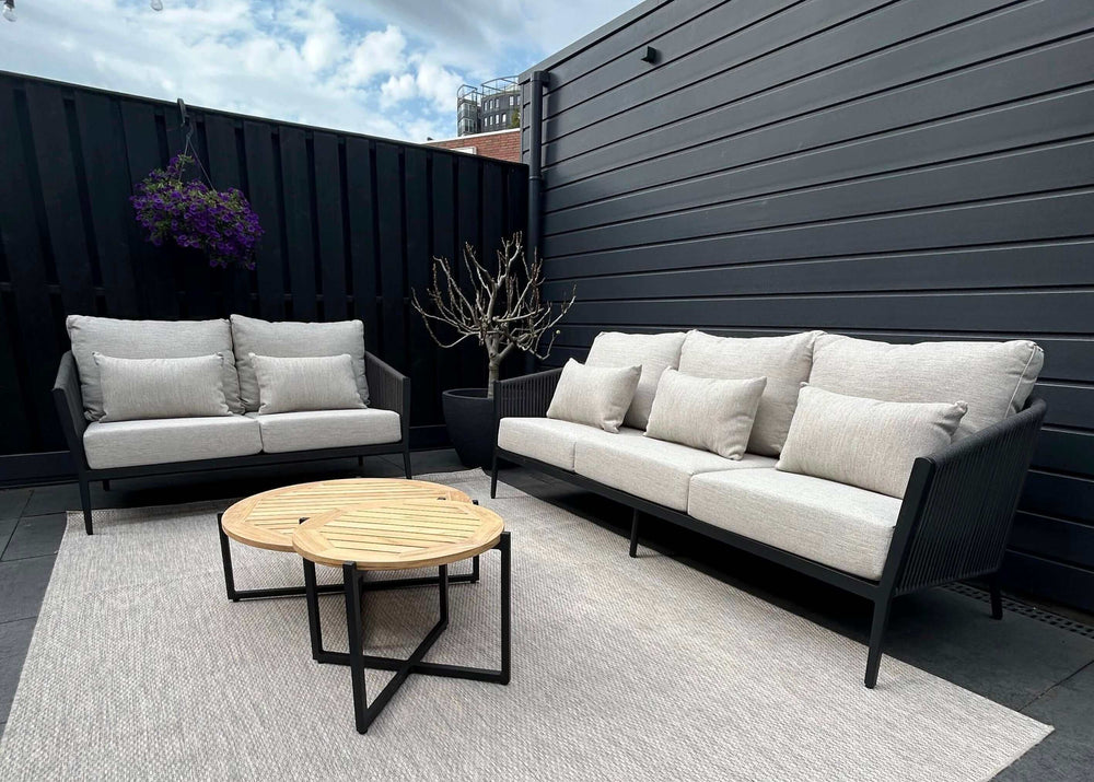 De Belito Ouddorp Koffietafelset, bestaande uit drie tafels van 76 cm, en 50 cm in Naturel Teak, combineert elegantie en functionaliteit. De hoogwaardige teakhouten tafelbladen met fijne latjes creëren een subtiel lijnenspel, terwijl het aluminium onderstel het een fraaie afwerking geeft. Deze set past perfect in zowel moderne als klassieke interieurs en biedt veelzijdigheid dankzij de verschillende formaten, ideaal voor grote én kleine ruimtes.