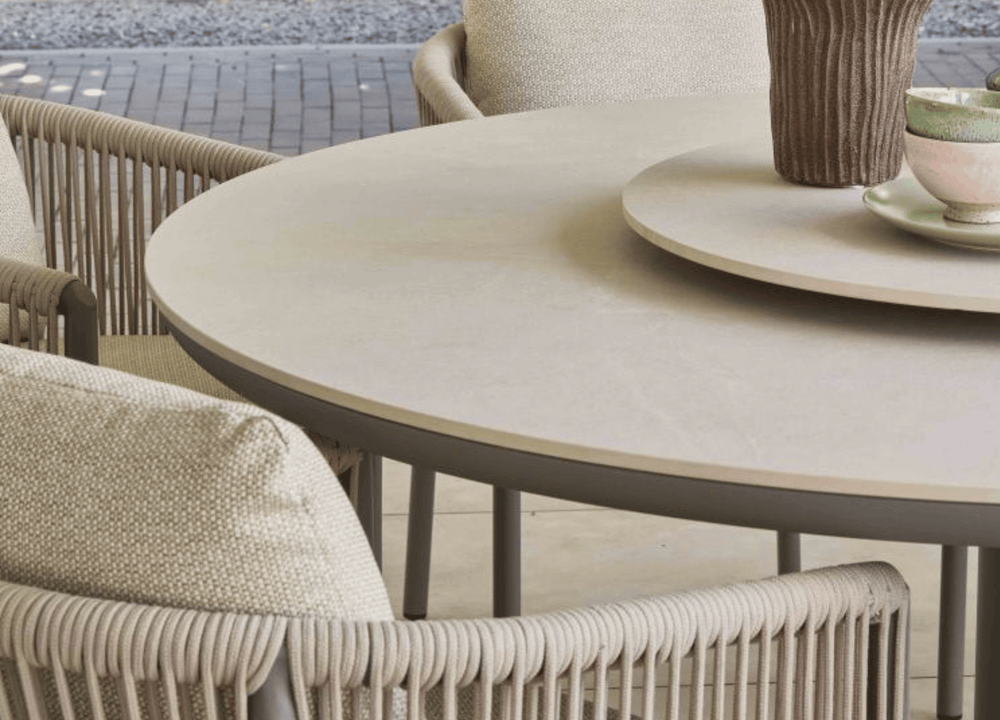 Het aluminium frame is omvlochten met outdoor textileen en is volledig weerbestendig en onderhoudsvrij. Zo geniet je jarenlang zorgeloos van comfort en een warme, natuurlijke uitstraling.