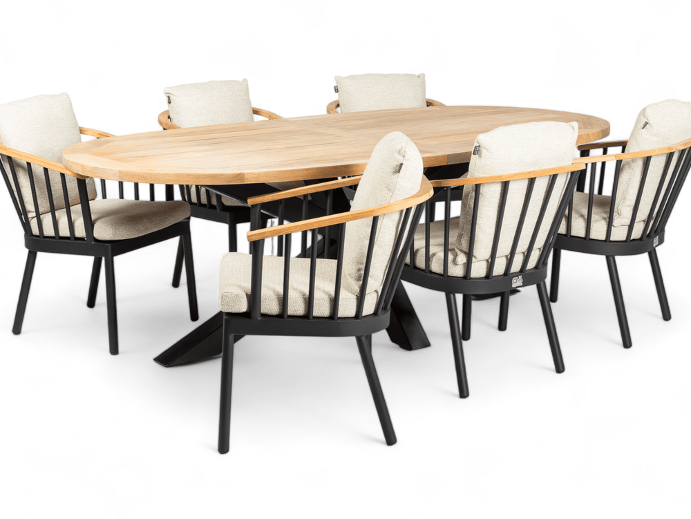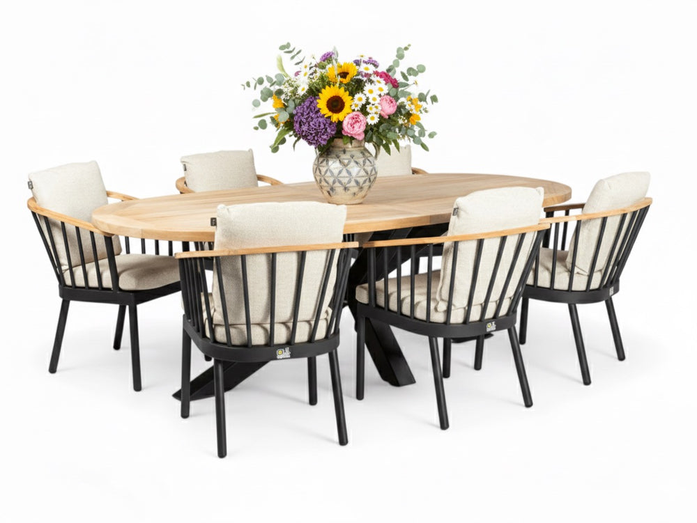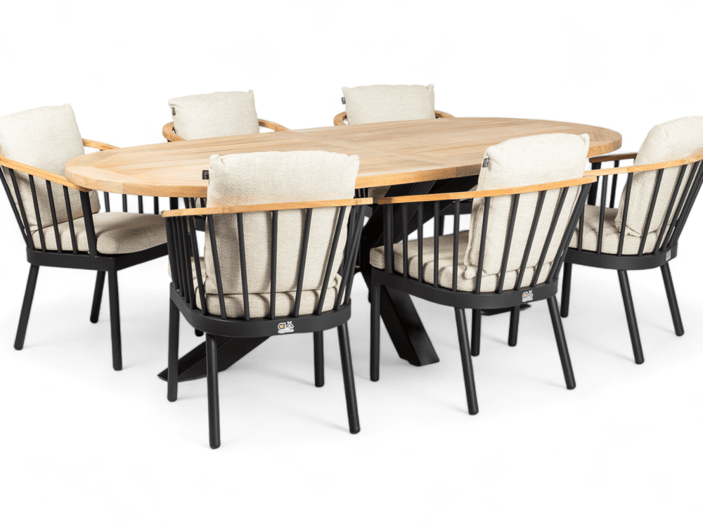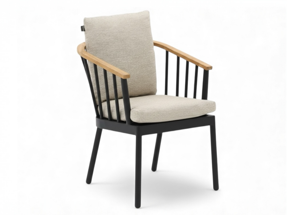Het matzwarte aluminium frame en de teakhouten leuningen zijn weerbestendig en onderhoudsvrij, voor jarenlang zorgeloos genieten met een warme, natuurlijke uitstraling.