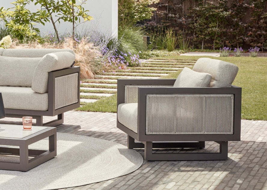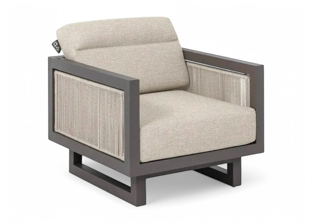 Breng verfijnde luxe naar je buitenruimte met de Santorini RopeLoungestoel, een toonbeeld van vakmanschap en eigentijdse elegantie. Deze loungestoel combineert een stevig aluminium frame met een warm taupe gepoedercoate afwerking. Het resultaat is een moderne, tijdloze uitstraling die perfect past in elke tuin of terras. De duurzame Bee Wett® all-weather kussens bieden uitzonderlijk comfort en zijn bestand tegen de elementen, waardoor je optimaal kunt genieten, ongeacht het weer.