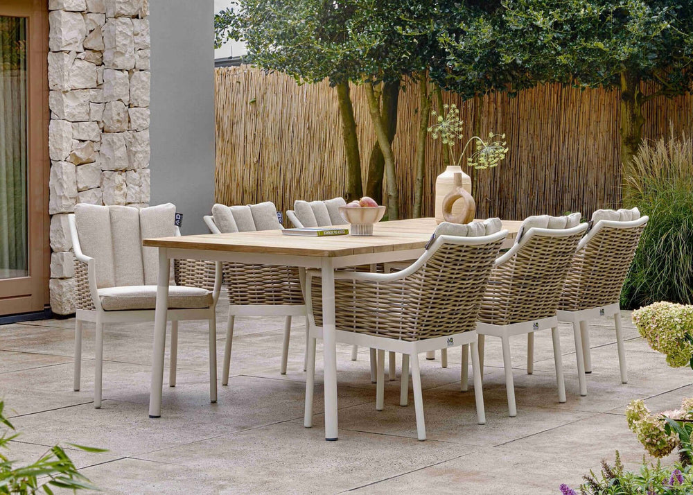 De Apple Bee Milou dining stoel combineert een tijdloze uitstraling met ultiem comfort. Met zijn robuuste vlechtwerk en luxe Bee Wett® kussens is deze stoel niet alleen een eyecatcher in je tuin, maar biedt hij ook langdurig zitcomfort voor buitenmaaltijden en ontspannen momenten.
