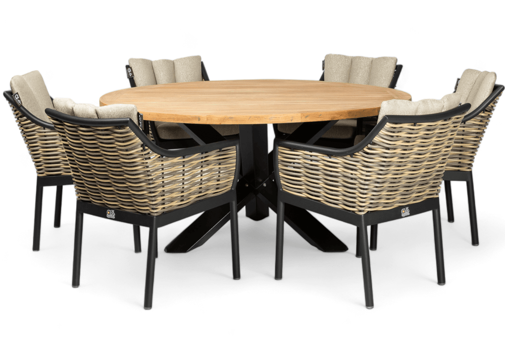 De Belito teakhouten tuintafel van 150 cm, gecombineerd met zes Apple Bee Milou dining stoelen, vormt een prachtige set die luxe en comfort uitstraalt. De natuurlijke uitstraling van het teakhouten tafelblad en het moderne vlechtwerk van de stoelen maken deze set een stijlvolle aanvulling op elke buitenruimte.
