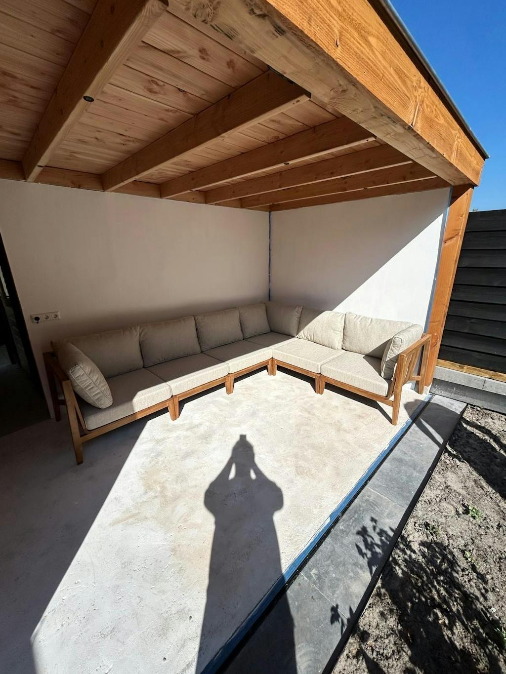 Ja, het duurzame teakhouten frame en de all-weather kussens maken de loungeset bestand tegen regen en zon. De kussens drogen binnen 1-2 uur na een regenbui.
