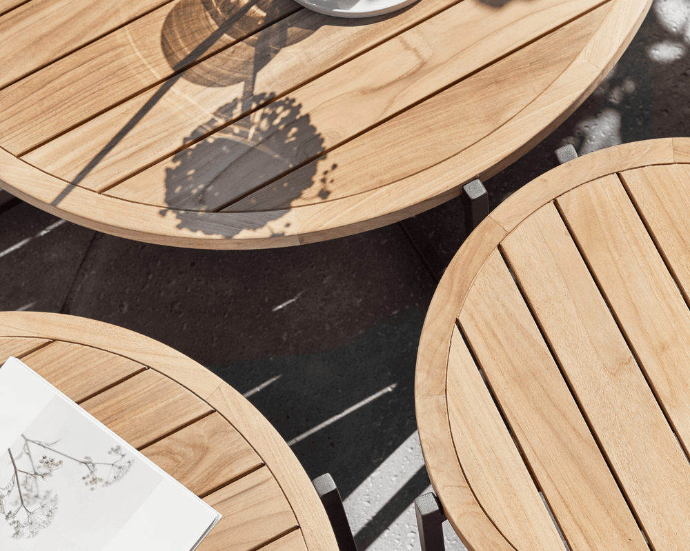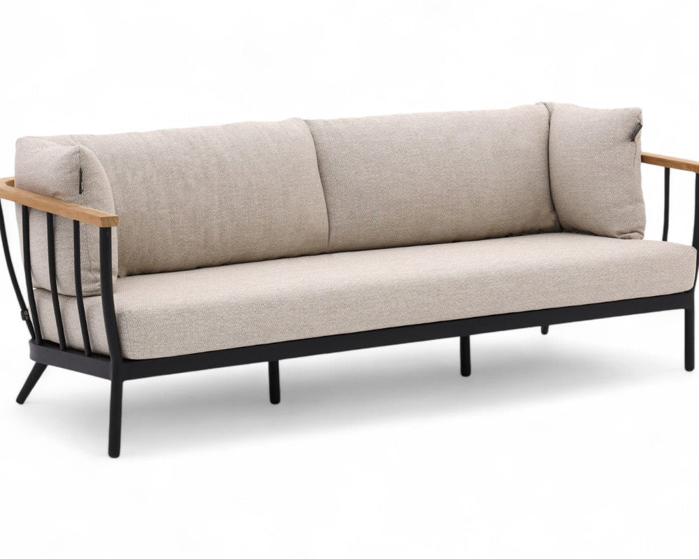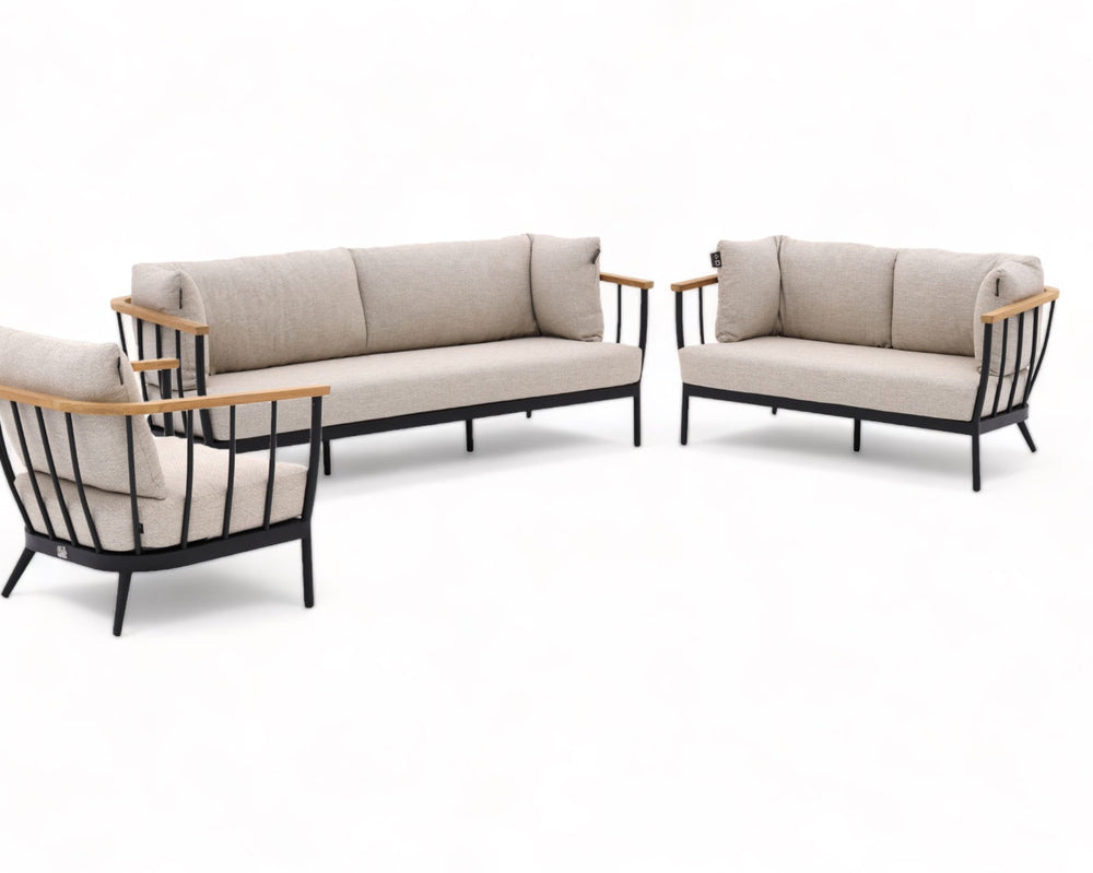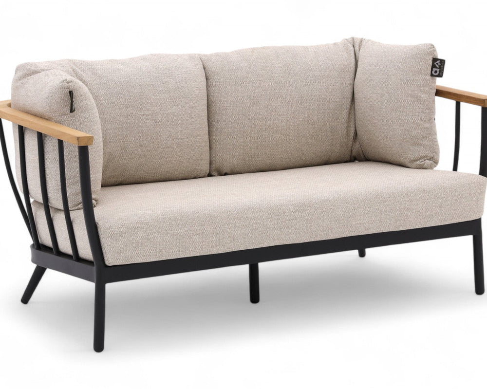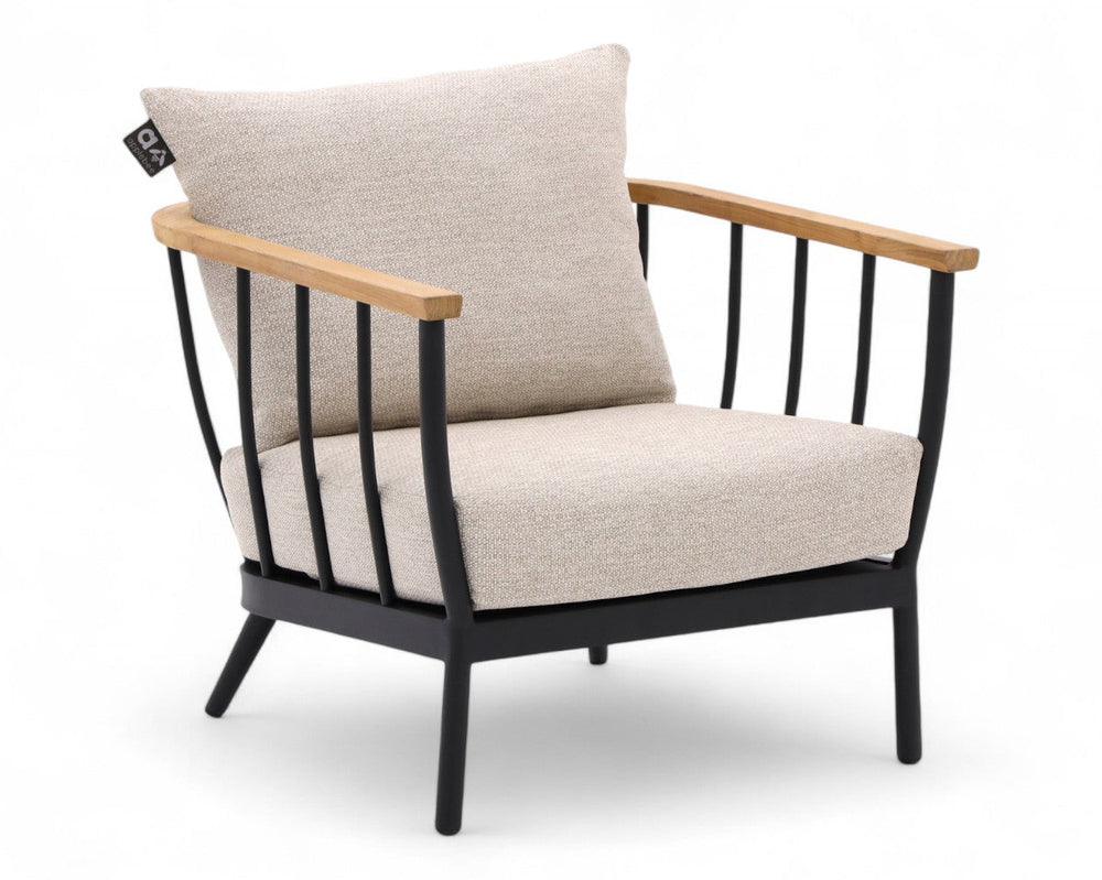 Het matzwarte aluminium frame en de teakhouten leuningen zijn weerbestendig en onderhoudsvrij, voor jarenlang zorgeloos genieten met een warme, natuurlijke uitstraling.