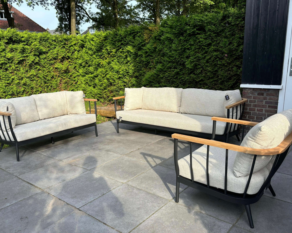 De Apple Bee Condor Loungeset biedt een perfecte combinatie van robuust design en natuurlijke elementen. Het matzwarte gepoedercoate aluminium frame geeft de set een strakke, stoere uitstraling, terwijl de teakhouten leuningen voor een warme touch zorgen. Dankzij de flexibele opstellingen met 1-, 2- en 3-zits mogelijkheden, past deze loungeset in elke tuin en is hij geschikt voor zowel compacte als royale buitenruimtes.