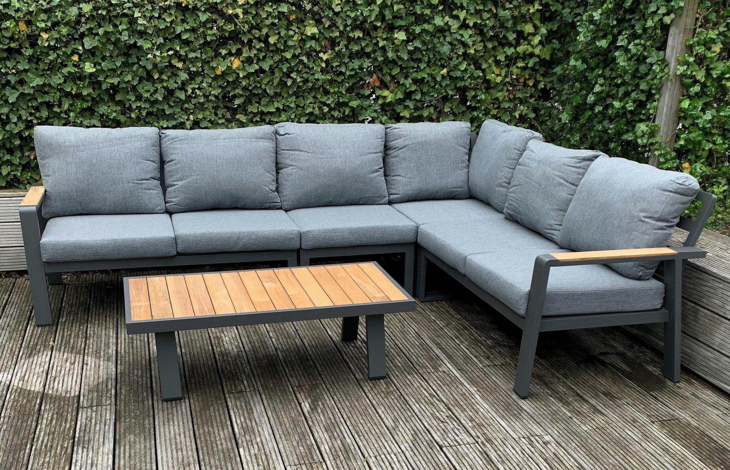 Een loungeset die design en comfort perfect combineert? Dat is de Belito Lotte Loungeset! Met een strak aluminium frame in Carbon Black, natuurlijke accenten van SVLK-gecertificeerd teakhout en 14 luxe Olefin kussens geniet je van ultiem zitcomfort, het hele jaar door. Deze royale hoekbank van 288 x 220 cm biedt plek aan 6-7 personen, ideaal voor gezellige avonden in de tuin. Dankzij het slimme ontwerp bepaal jij bovendien zelf of de lange zijde links of rechts komt!