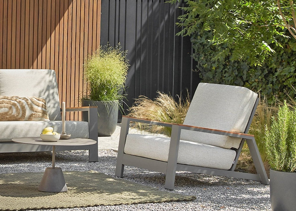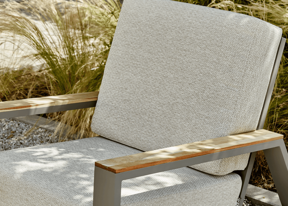 Het Taupe aluminium frame en de teakhouten leuningen zijn weerbestendig en onderhoudsvrij, voor jarenlang zorgeloos genieten met een warme, natuurlijke uitstraling.