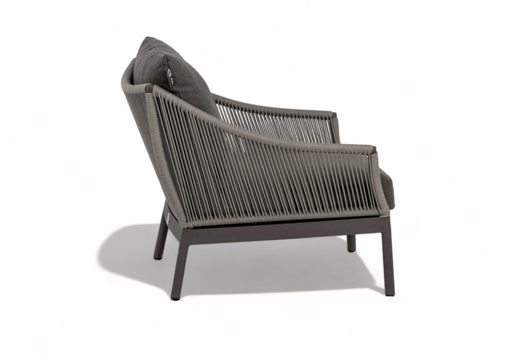 Het onderscheidende kenmerk van de Bijou loungestoel is het unieke tweelaags rope vlechtwerk. De innovatieve constructie houdt de hoeken open, waardoor het solide aluminium frame en de aantrekkelijke taupekleurige afwerking zichtbaar worden. De geraffineerde, vloeiende contouren geven de stoel een strak, maar toch elegant uiterlijk, dat in elke buitenomgeving past.