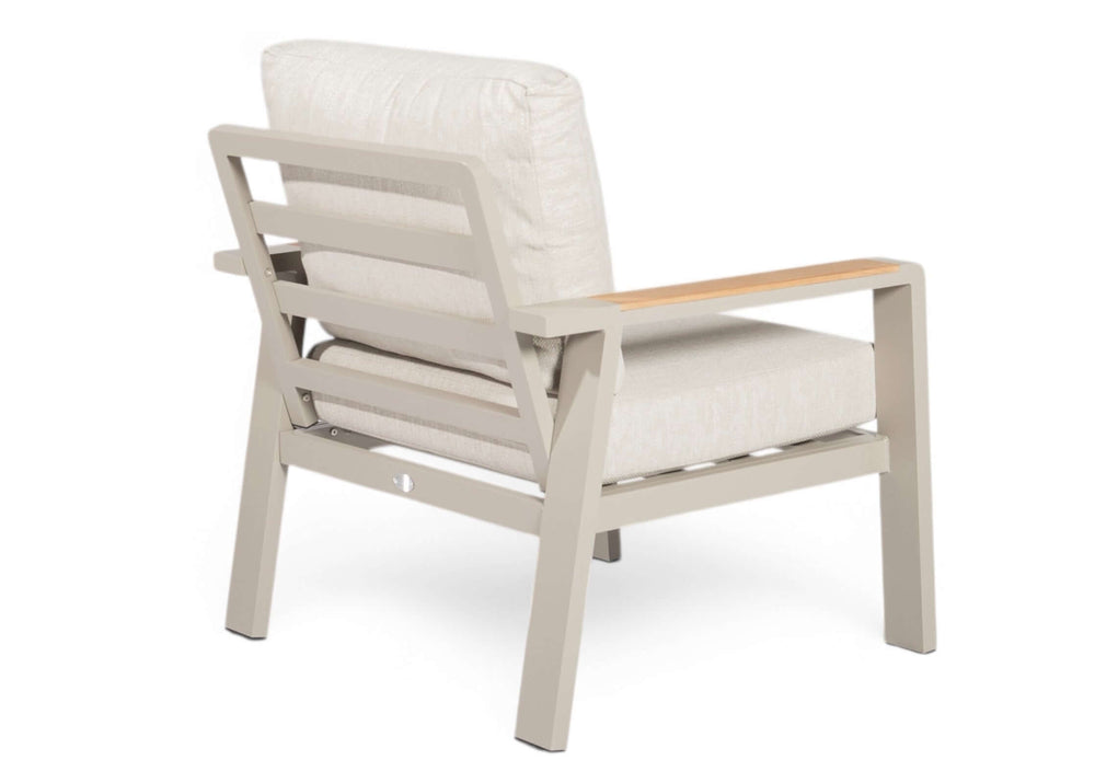 - Warme Teak Accenten – De armleuningen van echt teakhout bieden een comfortabel gevoel en een luxe uitstraling.