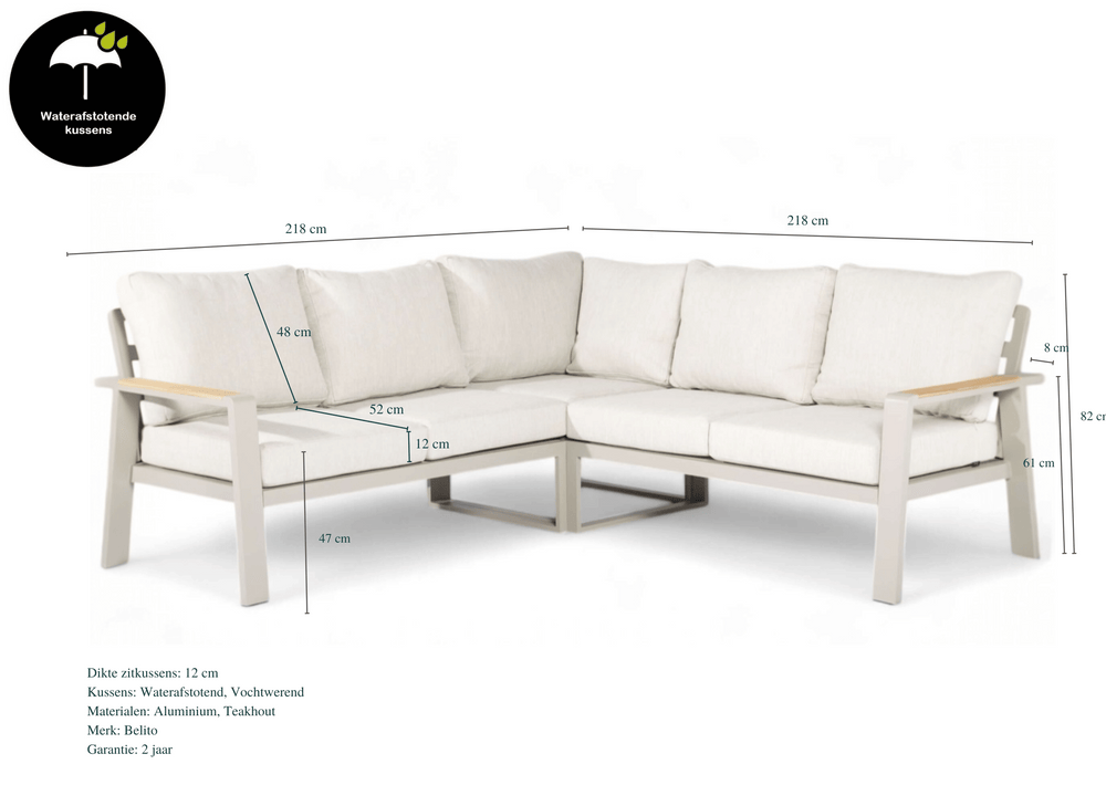 Een loungeset die design en comfort perfect combineert, zelfs in een compacte setting? Dat is de Belito Lotte Loungeset! Met een strak aluminium frame, natuurlijke teakhouten accenten en luxe Olefin kussens geniet je van ultiem zitcomfort, het hele jaar door.