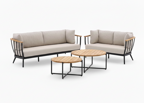 Het matzwarte aluminium frame en de teakhouten leuningen zijn weerbestendig en onderhoudsvrij, voor jarenlang zorgeloos genieten met een warme, natuurlijke uitstraling.
