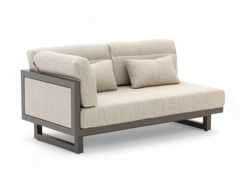 Het geheim van de Santorini zit in de details die je nergens anders ziet. De bank combineert de strakke lijnen van gepoedercoat aluminium met luxe gestoffeerde panelen, wat zorgt voor een hoogwaardige 'indoor-look' die speciaal is ontwikkeld voor het buitenleven.