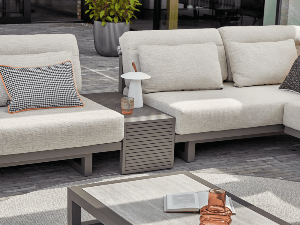 Ben je op zoek naar een loungeset die écht anders is dan de standaard? De Apple Bee Santorini is een eyecatcher in de puurste zin van het woord. Waar veel merken kiezen voor veilige en voorspelbare ontwerpen, durft de Santorini te breken met de regels. Met zijn verfijnde Quartz-frame en unieke gestoffeerde panelen heeft deze hoekbank (239 x 318 cm) een architectonische uitstraling die je bij geen enkel ander merk zult vinden. Het is geen gewoon tuinmeubel; het is een design-stuk dat van je terras een buitenruimte met allure maakt.