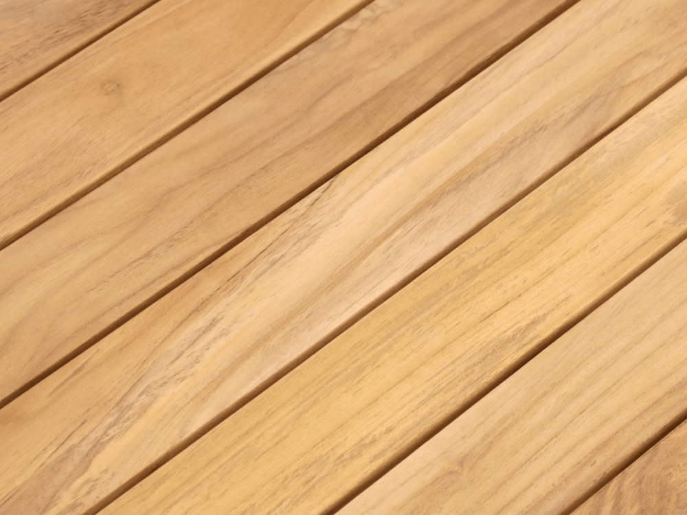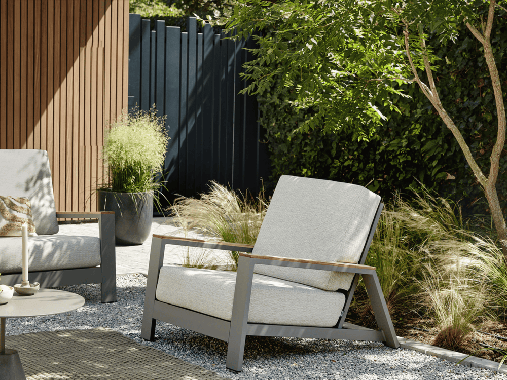 Het Taupe aluminium frame en de teakhouten leuningen zijn weerbestendig en onderhoudsvrij, voor jarenlang zorgeloos genieten met een warme, natuurlijke uitstraling.