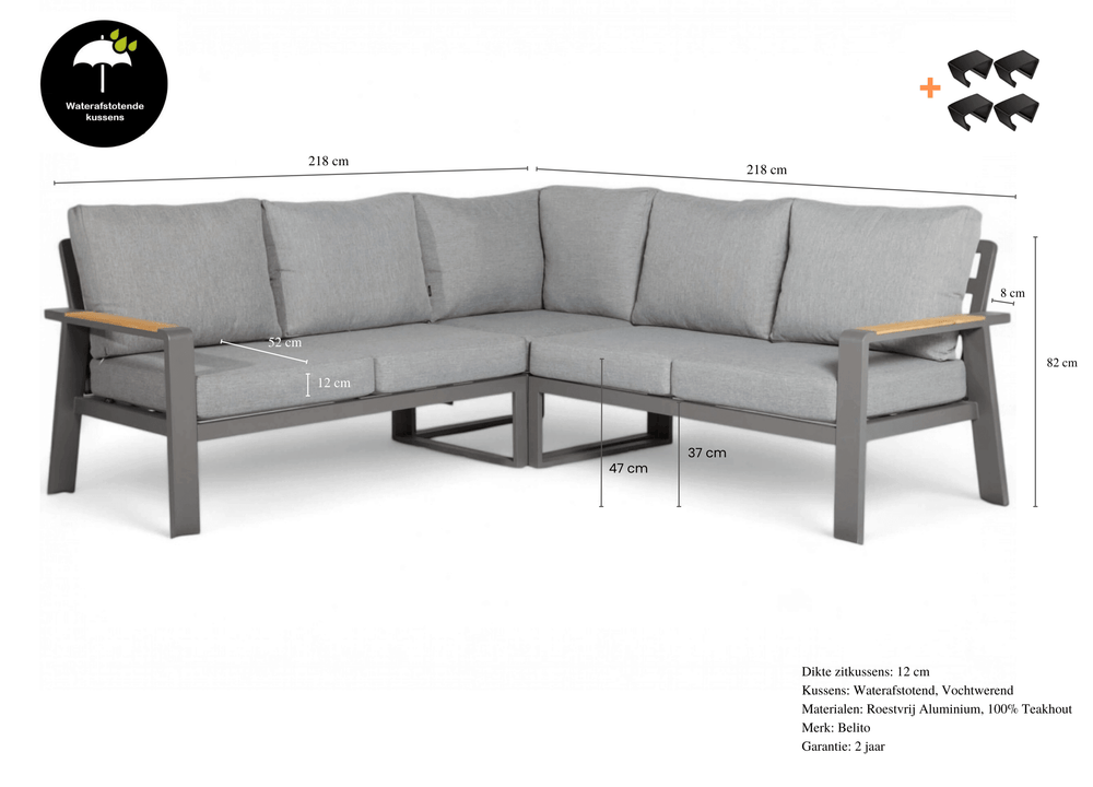 | Afmetingen bankdelen | 2 banken van 145 x 75 cm + 1 hoekelement (75 x 75 cm) |