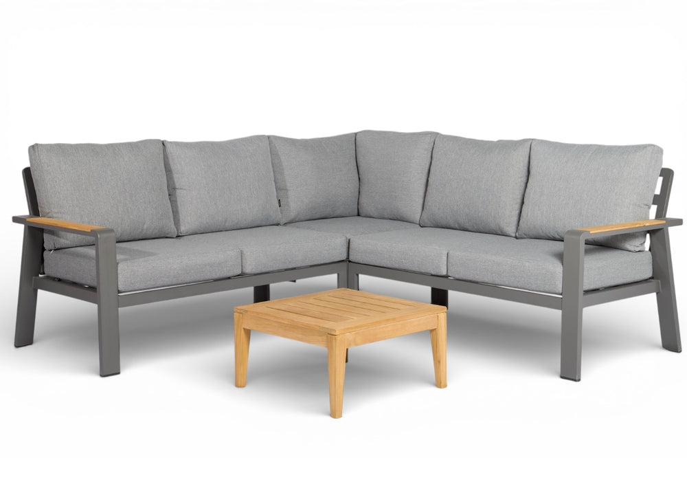 Zoek je een loungeset die design en comfort perfect combineert, maar heb je een compact terras of balkon? De Belito Lotte Loungeset in deze symmetrische opstelling van 220 x 220 cm biedt de luxe van een grote hoekbank in een slim formaat. Met een strak aluminium frame in antraciet, natuurlijke teakhouten details op de armleuningen en luxe Olefin kussens geniet je het hele jaar door van ultiem zitcomfort.