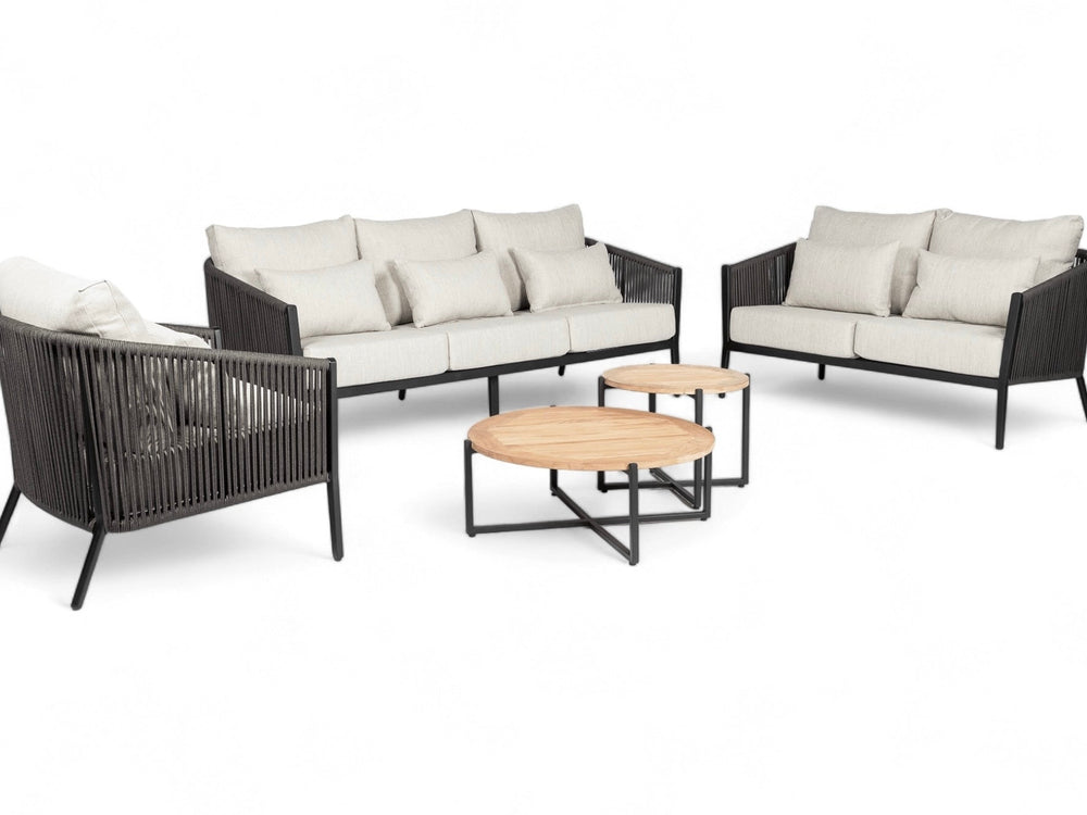 Op zoek naar een loungeset die stijl, comfort en gemak moeiteloos combineert? De Belito Ouddorp Loungeset heeft het allemaal! Het matzwarte aluminium frame, de luxe rope-afwerking en de all-weather kussens maken deze set perfect voor een moderne tuin. Voeg daar de stijlvolle teakhouten koffietafelset aan toe en je hebt dé ultieme plek om te ontspannen.