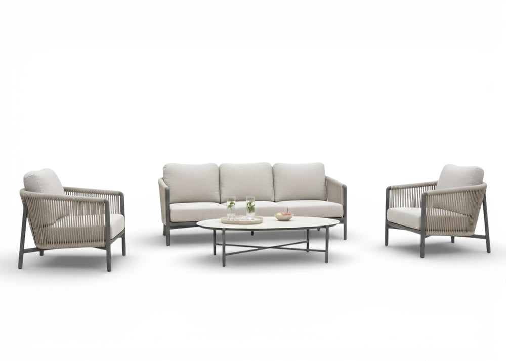 De Apple Bee Bora Bora Loungeset biedt een perfecte mix van verfijnd design en functionele luxe. Deze set bestaat uit twee stoelen, een 3-zits bank en de bijpassende tafel. Het taupe aluminium frame is met zorg omweven met rope, wat zorgt voor een elegante en moderne uitstraling, terwijl de subtiele details zoals de afgeschuinde armleuningen en de verder naar buiten geplaatste achterpoten het ontwerp een extra dimensie geven. Bekijk de complete Bora Bora collectie om alle gewenste opstellingen te zien! Staat de voor u gewenste opstelling niet tussen? Geen probleem, neem dan contact met ons op en wij maken voor u een prijs op maat.