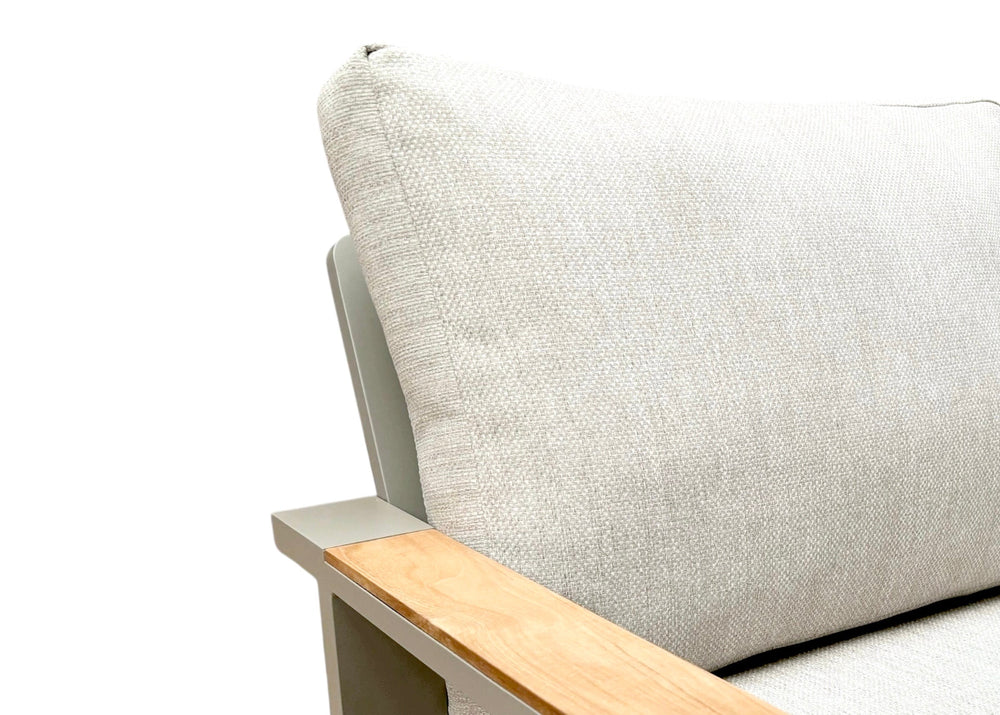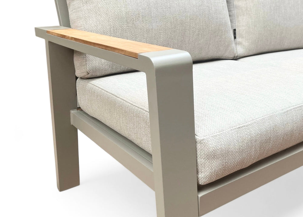 De Belito Birmingham Tuinbank (211 cm) is de ideale 3-zitsbank voor wie op zoek is naar royale ruimte en elegantie in de tuin. Dit model kenmerkt zich door een stijlvol taupe aluminium frame dat garant staat voor duurzaamheid en onderhoudsgemak. De bank wordt geaccentueerd door warme teakhouten armleuningen en voorzien van dikke, waterafstotende Olefin kussens in een beige/naturel tint. Dit samenspel van kleuren en materialen creëert een luxe, tijdloze uitstraling, perfect voor lange, ontspannen avonden buiten.