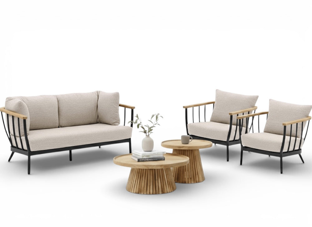Bent u op zoek naar een loungeset die een echt statement maakt op uw terras? De Apple Bee Condor Black is de definitie van robuust design. In deze indrukwekkende opstelling vormt de 150 cm loungebank het middelpunt, geflankeerd door twee luxe loungestoelen. Het diepzwarte aluminium frame geeft de set een stoere, industriële uitstraling, terwijl de brede teakhouten armleuningen zorgen voor een warme, natuurlijke touch. Samen met de ronde Belito Daan tafelset creëert u een moderne buitenruimte met een ongekende allure.