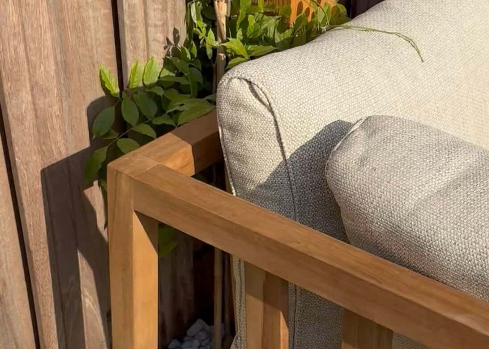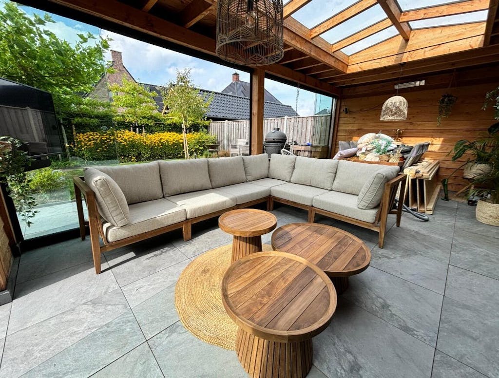 Ja, het duurzame teakhouten frame en de all-weather kussens maken de loungeset bestand tegen regen en zon. De kussens drogen binnen 1-2 uur na een regenbui.