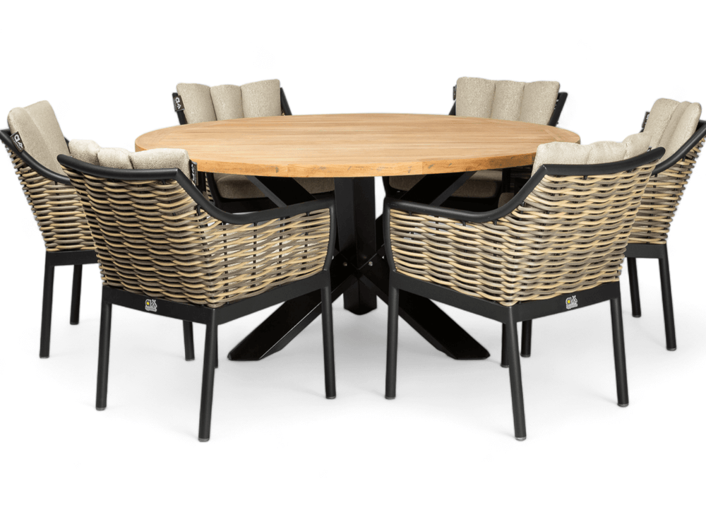 De Belito teakhouten tuintafel van 150 cm, gecombineerd met zes Apple Bee Milou dining stoelen, vormt een prachtige set die luxe en comfort uitstraalt. De natuurlijke uitstraling van het teakhouten tafelblad en het moderne vlechtwerk van de stoelen maken deze set een stijlvolle aanvulling op elke buitenruimte.