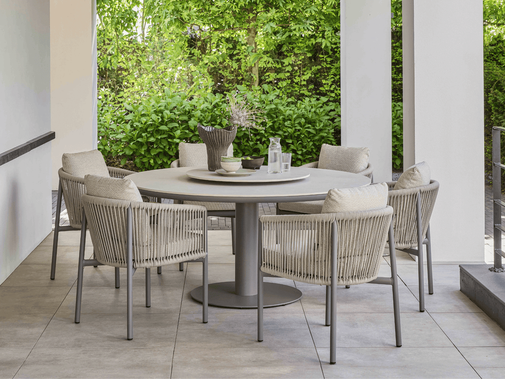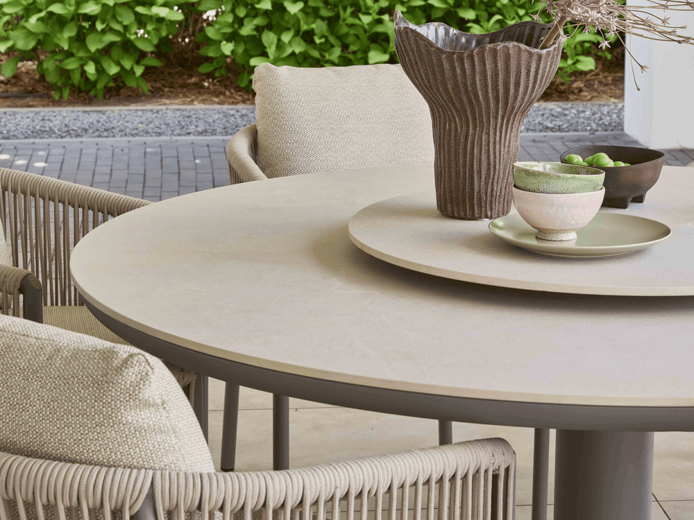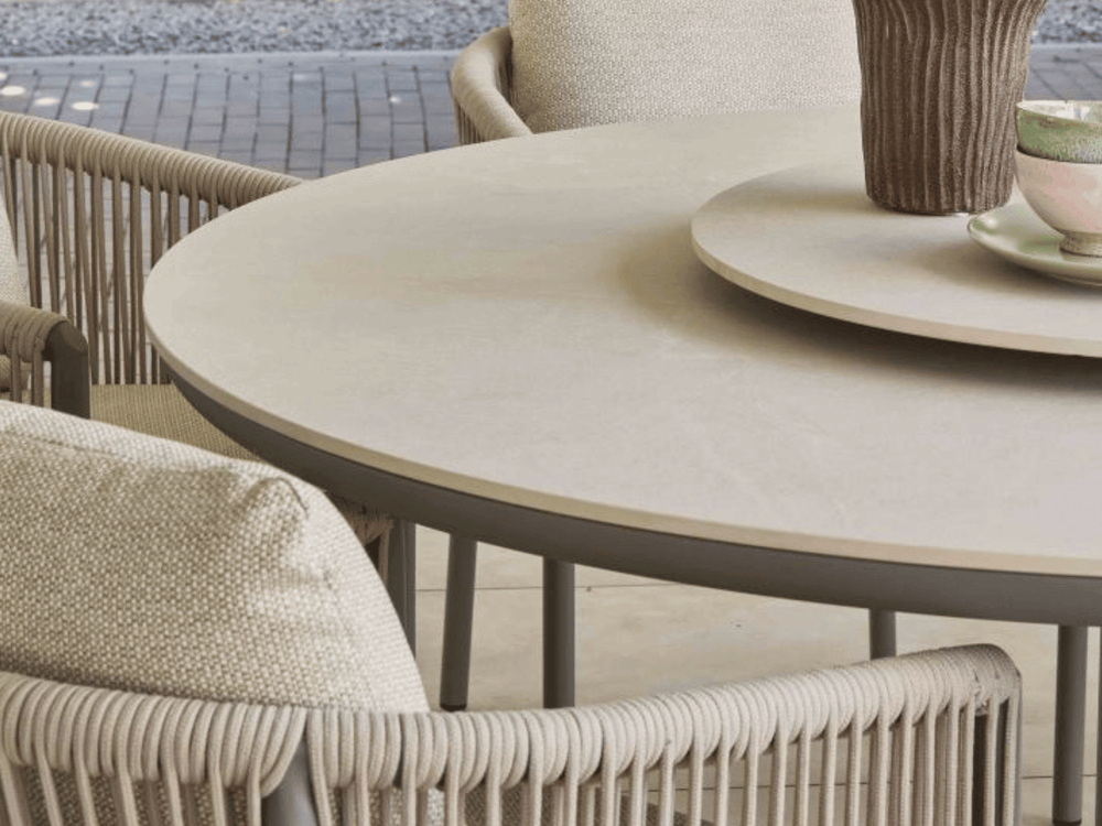 Het aluminium frame is omvlochten met outdoor textileen en is volledig weerbestendig en onderhoudsvrij. Zo geniet je jarenlang zorgeloos van comfort en een warme, natuurlijke uitstraling.