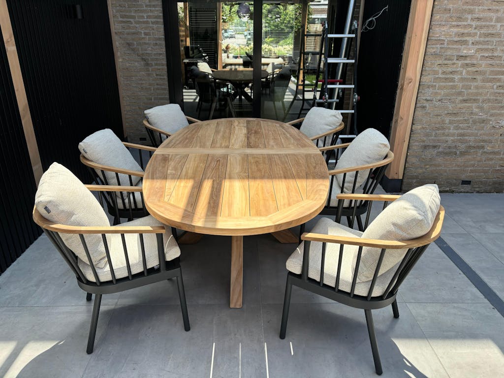 • Ruime tafel – De Belito® ovale teak tafel biedt ruimte voor zes tot 8 personen.