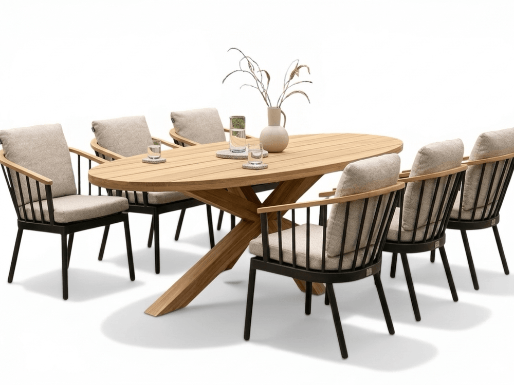 Het matzwarte aluminium frame en de teakhouten leuningen zijn weerbestendig en onderhoudsvrij, voor jarenlang zorgeloos genieten met een warme, natuurlijke uitstraling.