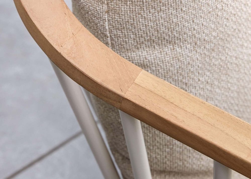 Het matzwarte aluminium frame en de teakhouten leuningen zijn weerbestendig en onderhoudsvrij, voor jarenlang zorgeloos genieten met een warme, natuurlijke uitstraling.