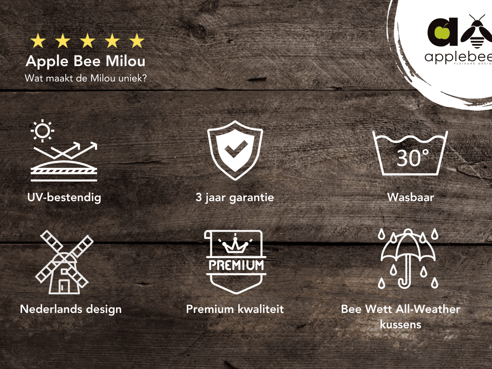De Apple Bee Milou is volledig onderhoudsvrij dankzij het Biculair® vlechtwerk en roestbestendig aluminium frame. Een vochtige doek erover en hij is weer als nieuw – geen gedoe, alleen genieten.