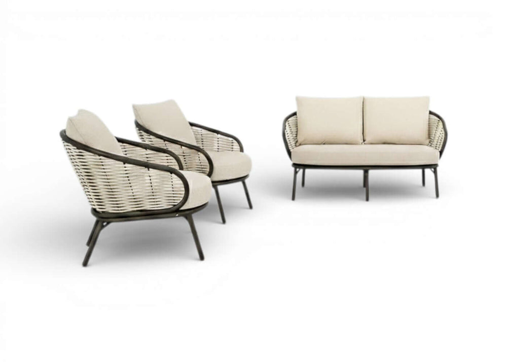 De Apple Bee Pine Key Bronze Loungeset Nr. 7 is een compacte maar uiterst luxe opstelling, ideaal voor een sfeervol terras of een gezellige veranda. In deze 3-delige configuratie wordt de comfortabele 2-zits bank gecombineerd met twee royale loungestoelen. Het Bronze gepoedercoate aluminium frame in combinatie met het lichte Oyster vlechtwerk geeft deze set een warme, exclusieve uitstraling die direct een statement maakt in uw tuin.