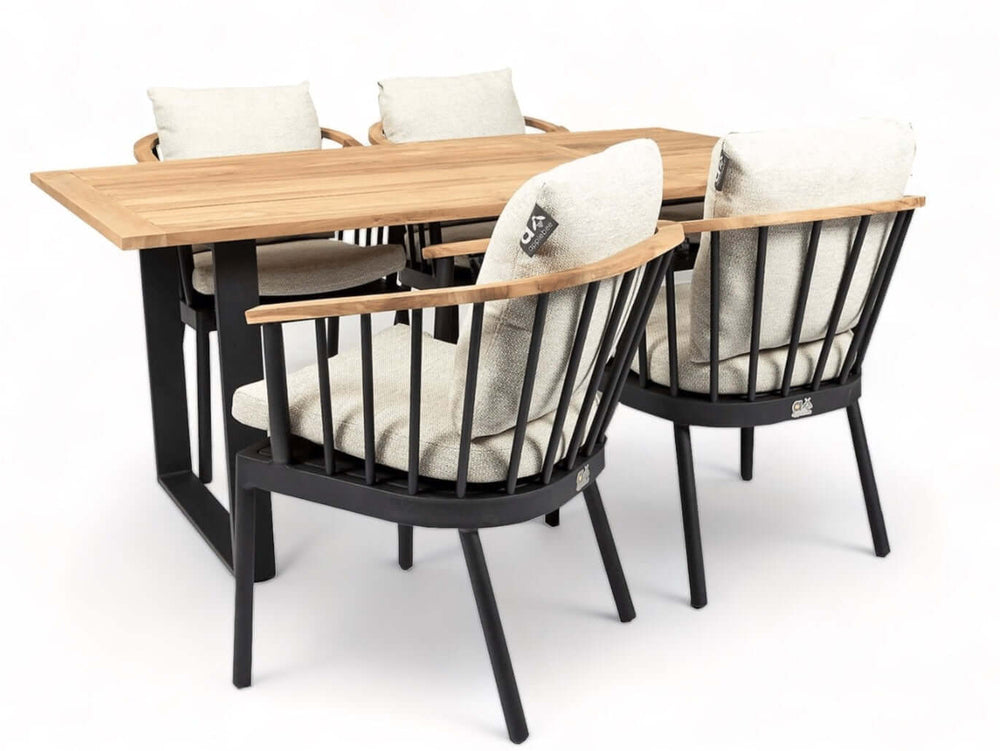 De Apple Bee Condor Tuinset (190 cm tafel) combineert een strak, modern design met ultiem comfort. Dankzij het slanke ontwerp en de zwarte accenten is deze tuinset perfect voor een moderne tuin of terras. De Condor tuinstoelen hebben een zwart aluminium frame, afgewerkt met teakhouten details op de arm- en rugleuningen. Dit geeft de set een verfijnde, luchtige uitstraling.