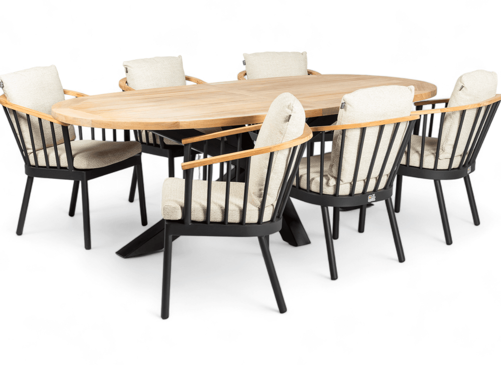 De Belito Mees dining tuintafel is een elegant ovaal meesterwerk dat functionaliteit en stijl samenbrengt. Met een royale lengte van 240 cm biedt deze tafel genoeg ruimte voor gezellige diners in de buitenlucht. Het Grade A teakhouten blad in combinatie met het robuuste aluminium onderstel zorgt voor een moderne, luxe uitstraling die in elke tuin past.