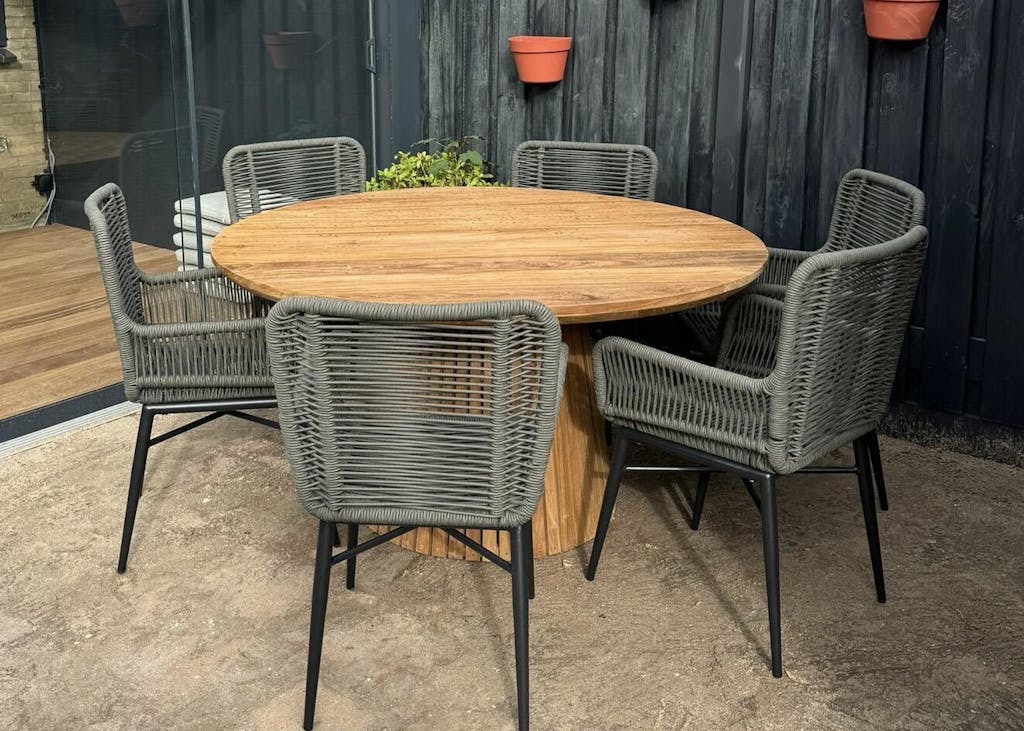 - Weerbestendig teakhout – Bestand tegen regen en zon, met een lange levensduur.