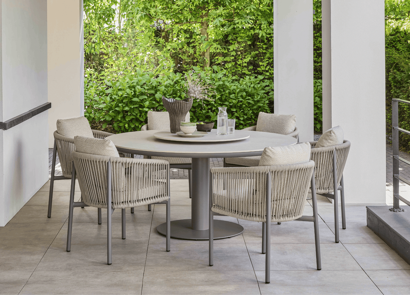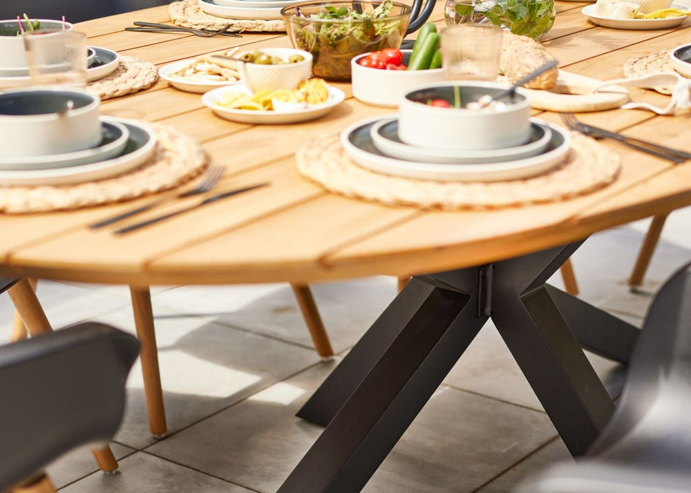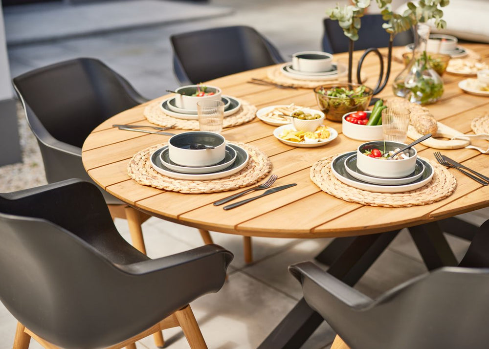 • Tafelblad van teakhout – Duurzaam en bestand tegen alle weersomstandigheden.