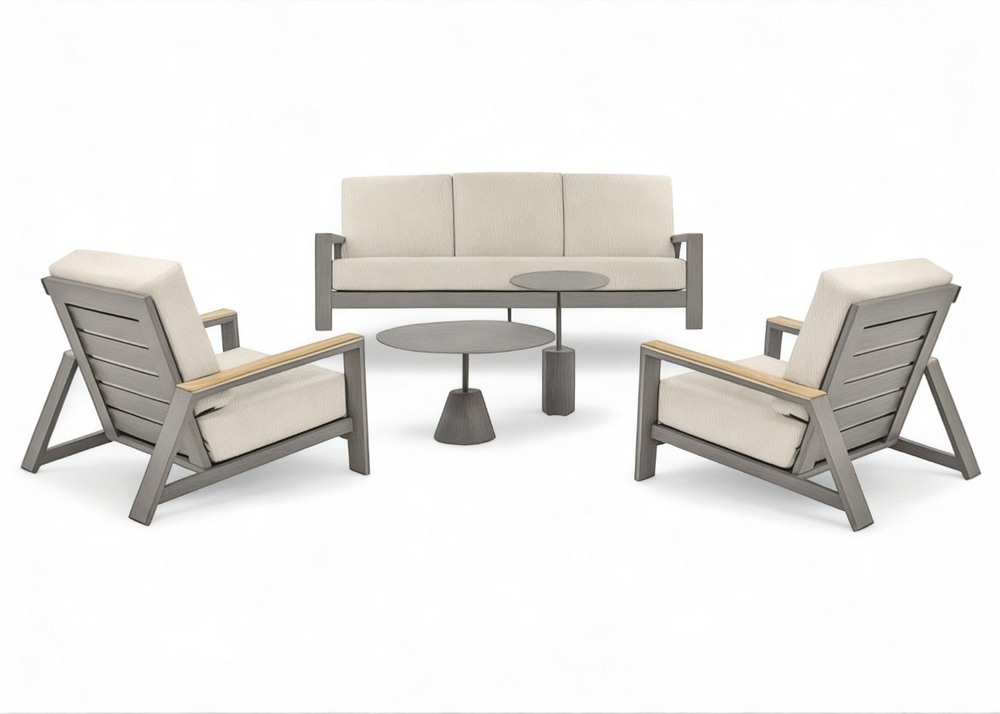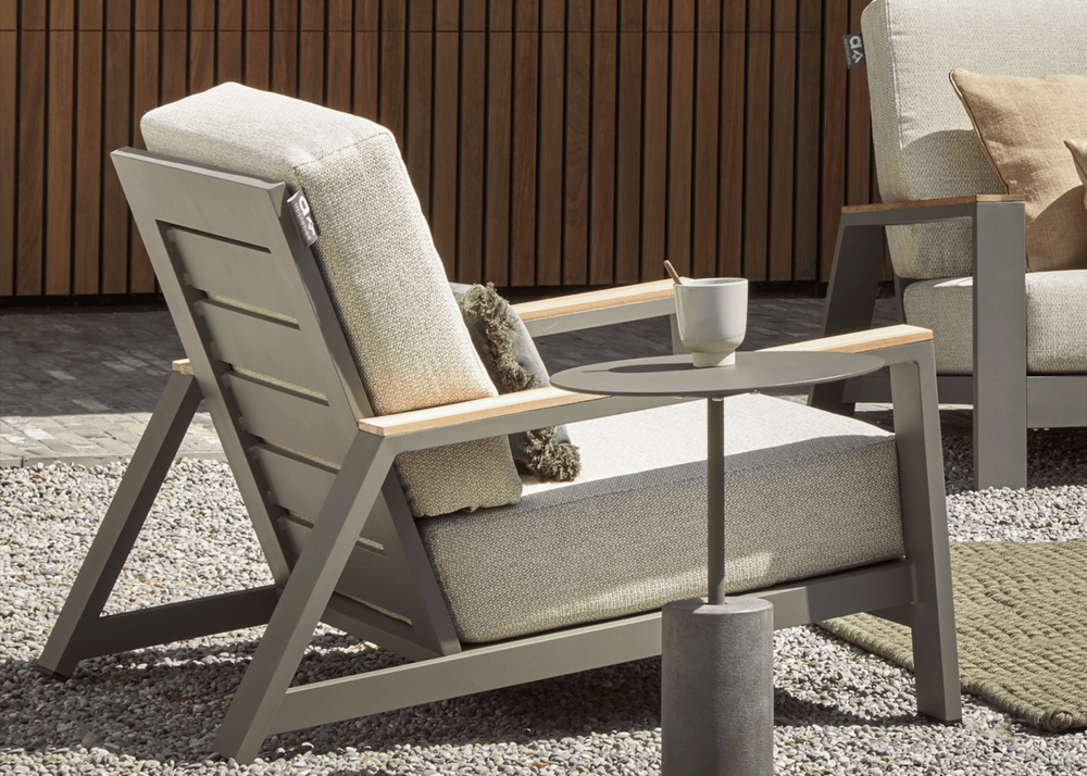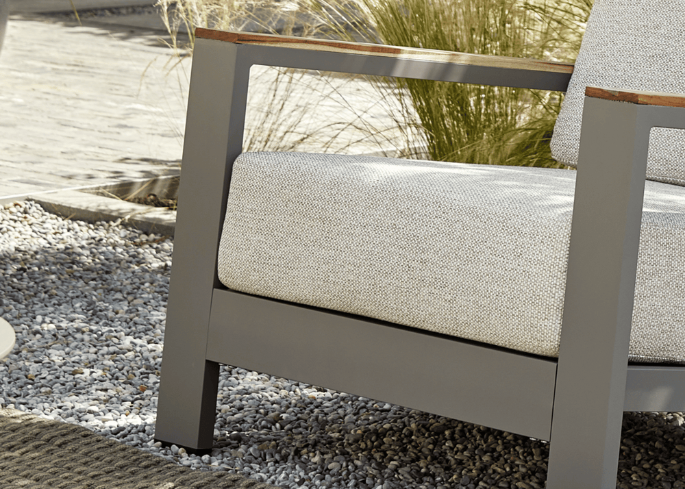 Het Taupe aluminium frame en de teakhouten leuningen zijn weerbestendig en onderhoudsvrij, voor jarenlang zorgeloos genieten met een warme, natuurlijke uitstraling.